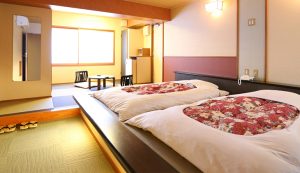 The resort overlooks the largest Fuji Five Lake, nicknamed Swan Lake for its graceful birds, in Yamanashi Prefecture. Multi-level maisonette rooms feature wood or garden views, twin beds or futons, with mini kitchen in each room. Amenities include a public bath (not onsen), restaurant, sauna, kids’ games room, and BBQ area.