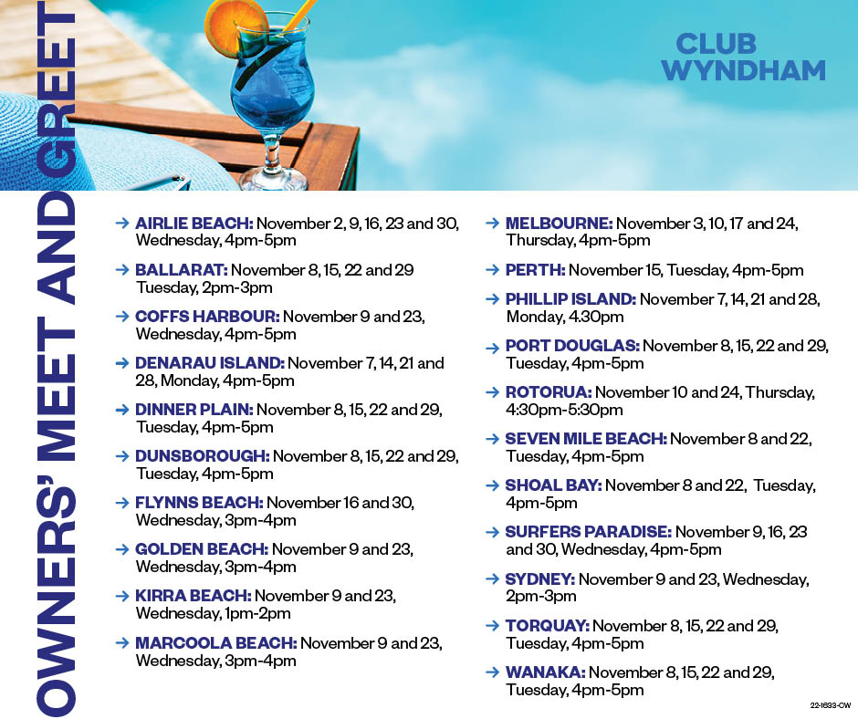 Club Wyndham South Pacific owners are able to make reservations at the Associate Resort from 9am on Wednesday, November 2. This agreement runs until October 31, 2023.