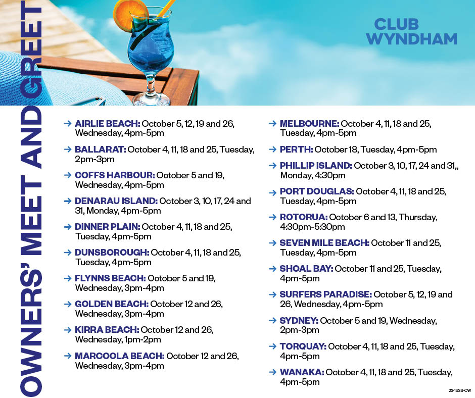 We also post the monthly list at our Facebook group, exclusively for Club Wyndham South Pacific owners. Please supply your owner number to join the group.