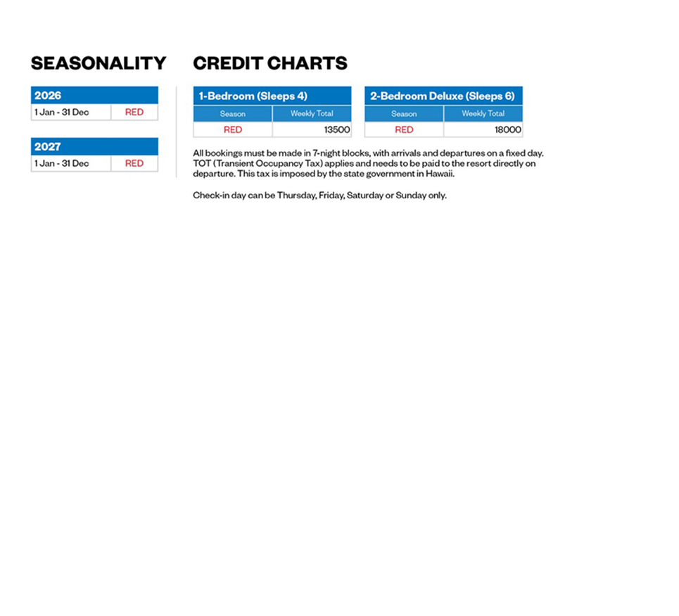 - TOT (Transient Occupancy Tax) of approximately $6 to $12 USD per night (2018 rates), depending on the apartment type, needs to be paid to the resort directly on departure. This tax is imposed by the state government in Hawaii, not dissimilar to the STT in place at Fiji.