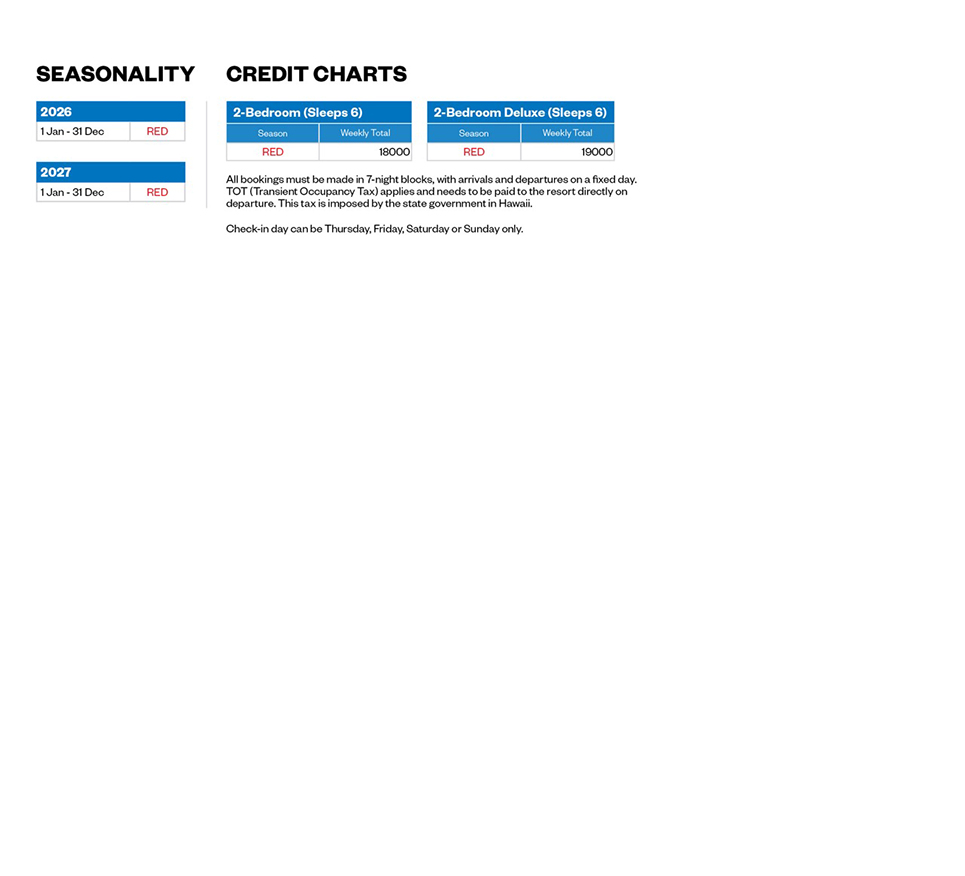- TOT (Transient Occupancy Tax) of approximately $6 to $12 USD per night (2018 rates), depending on the apartment type, needs to be paid to the resort directly on departure. This tax is imposed by the state government in Hawaii, not dissimilar to the STT in place at Fiji.