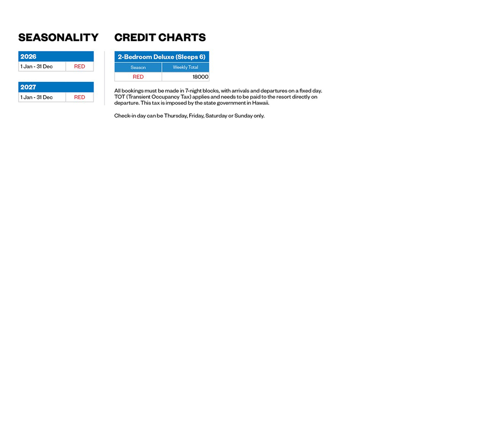 • TOT (Transient Occupancy Tax) of approximately $6 to $12 USD per night (2018 rates), depending on the apartment type, needs to be paid to the resort directly on departure.  This tax is imposed by the state government in Hawaii, not dissimilar to the STT in place at Fiji.