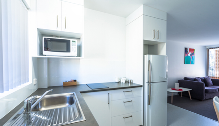 Kitchen: Kitchens do not have an oven but have a 2-burner stove top, microwave, and fridge.